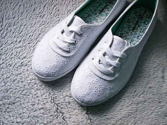 Dodatkowo na zdjęciu widzicie moje ostatnie zakupy w Deichmannie, czyli białe tenisówki damskie Graceland w romantycznym wydaniu, które nabyłam z kartą stałego klienta za niecałe 45 zł.